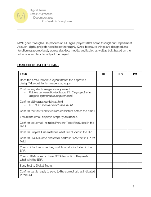 With a new year brings new perspective, new goals, and new habits. In working with Trey, as well as speaking to you all about a more formal QA Process to follow, I would like to present the Digital team’s QA process documentation. The documentation is specifically for new emails as well as landing page (any new landing pages we design/build, updates we make to existing landing pages, etc). New web builds QA doc is in the works!