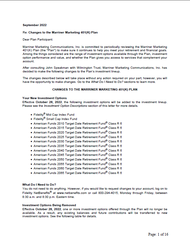 Periodic reviews of your 401k plan investments are carried out to ensure you continue to receive a competitive retirement benefit. After an evaluation of your plan investments and fees, the following changes will be implemented effective October 28, 2022.