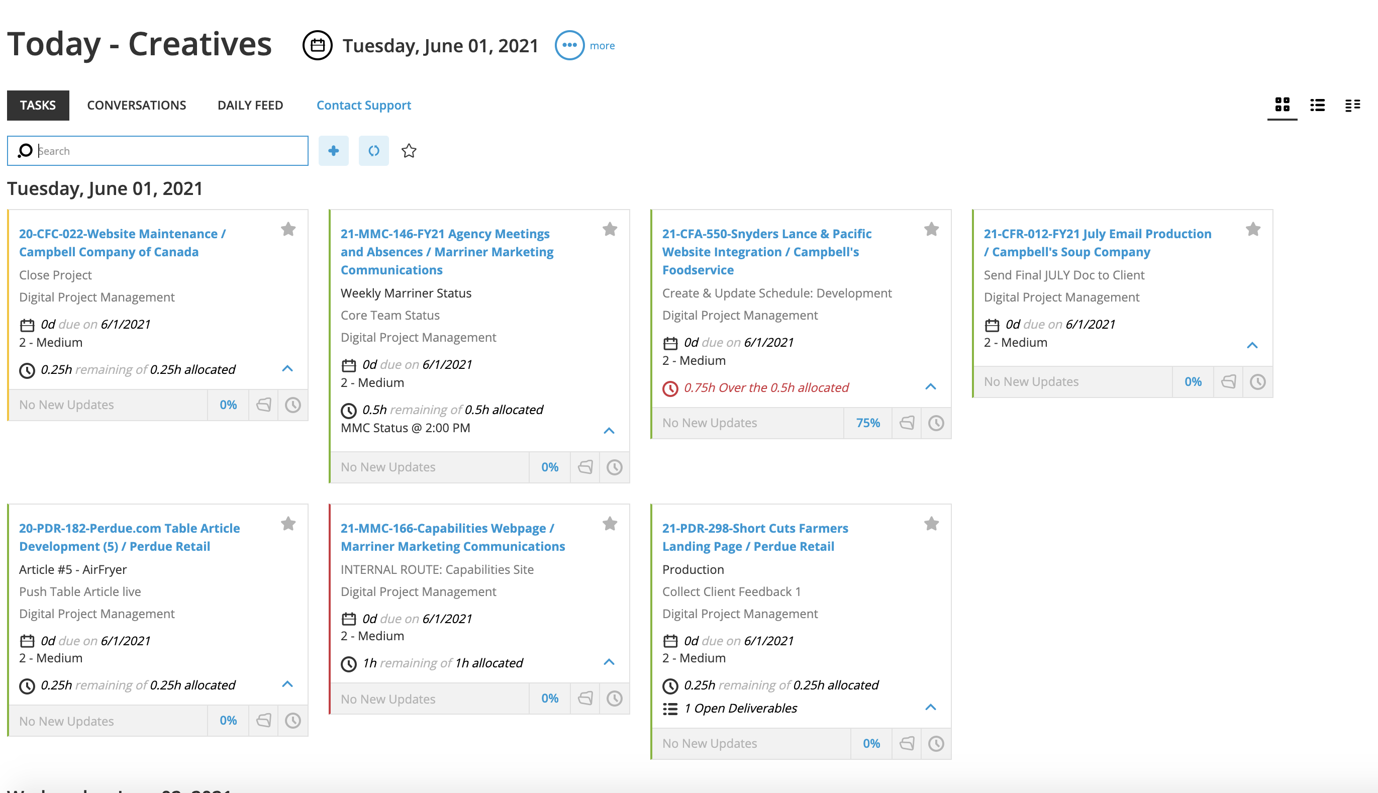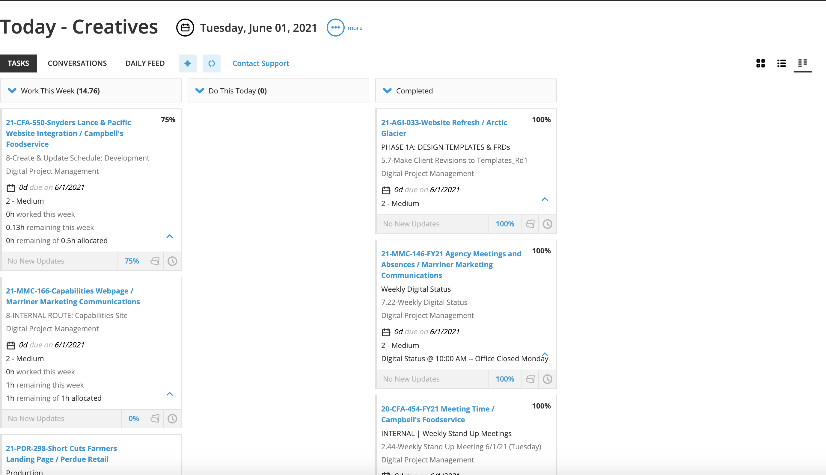 Tile View | This view is unique among the available views and is hidden by default. This view allows you to view completed tasks for the week, as well as tasks in Progress. You can use this view to log time on tasks that may come back after being completed.