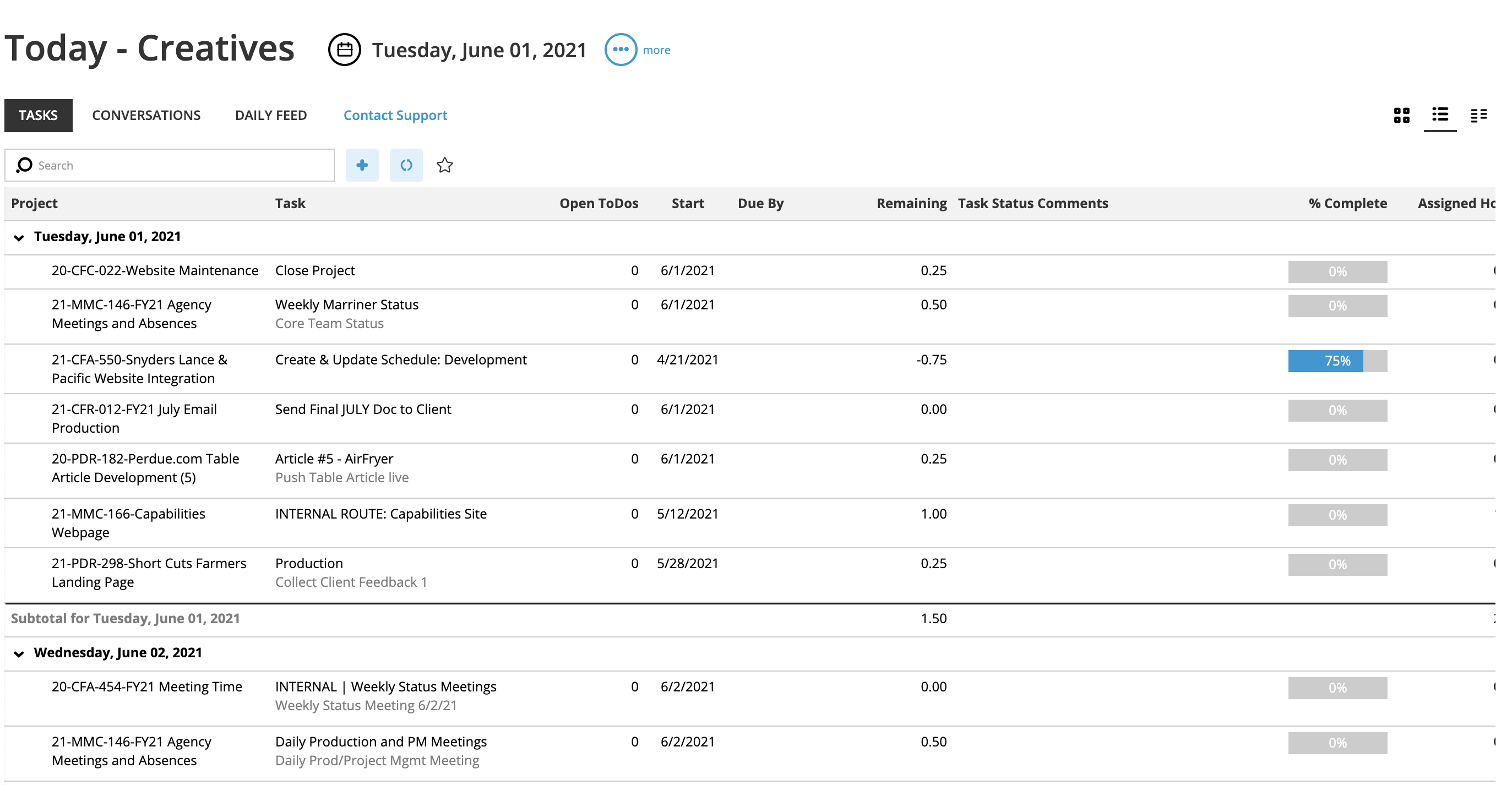 This is the main area of concentration for your creatives. This includes viewing their assignments, entering Time, completing Tasks and accessing further details of the project. You can also click the star icon to favorite tasks.